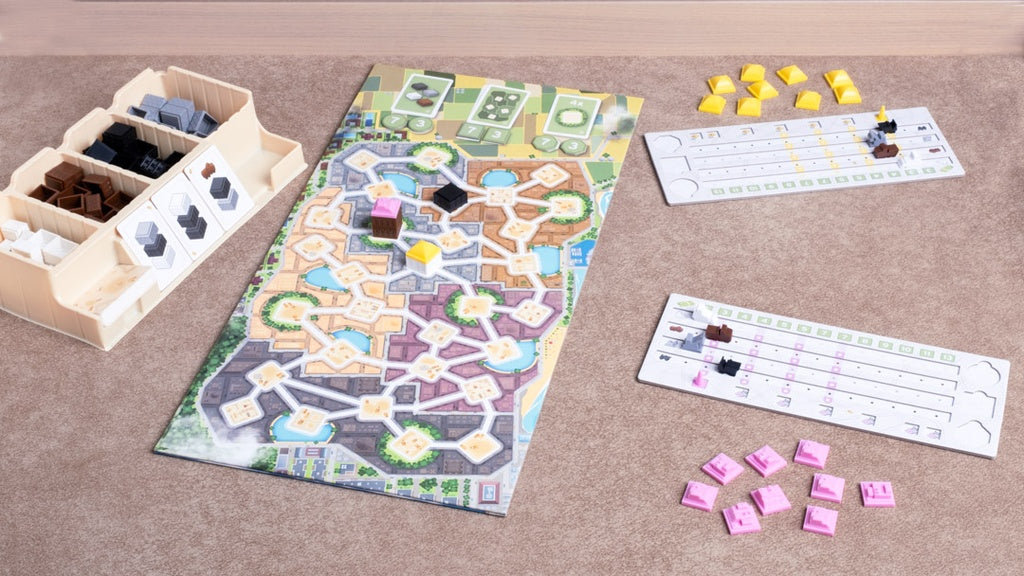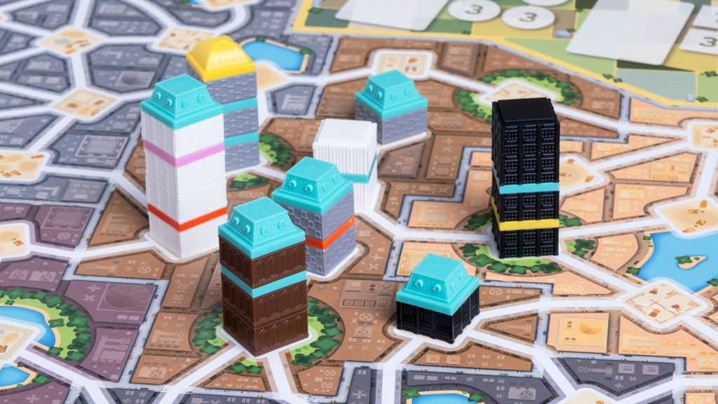 Planifica y construye: Coloca tus pisos y tejados estratégicamente, teniendo en cuenta que dos edificios adyacentes nunca pueden ser del mismo color. Al construir, debes participar en la construcción de todos los edificios adyacentes.